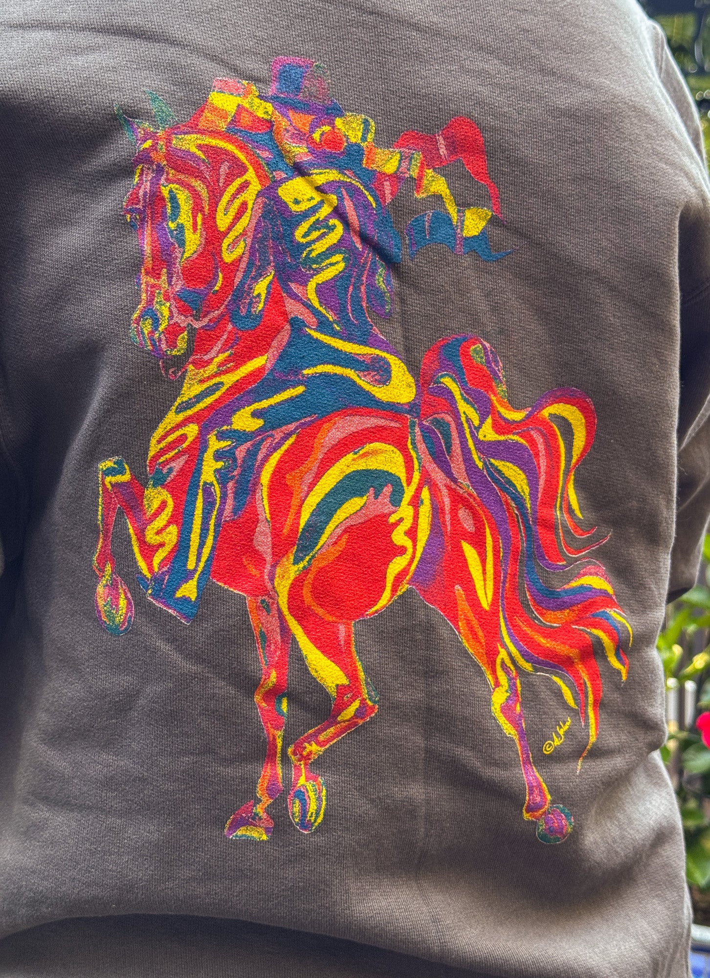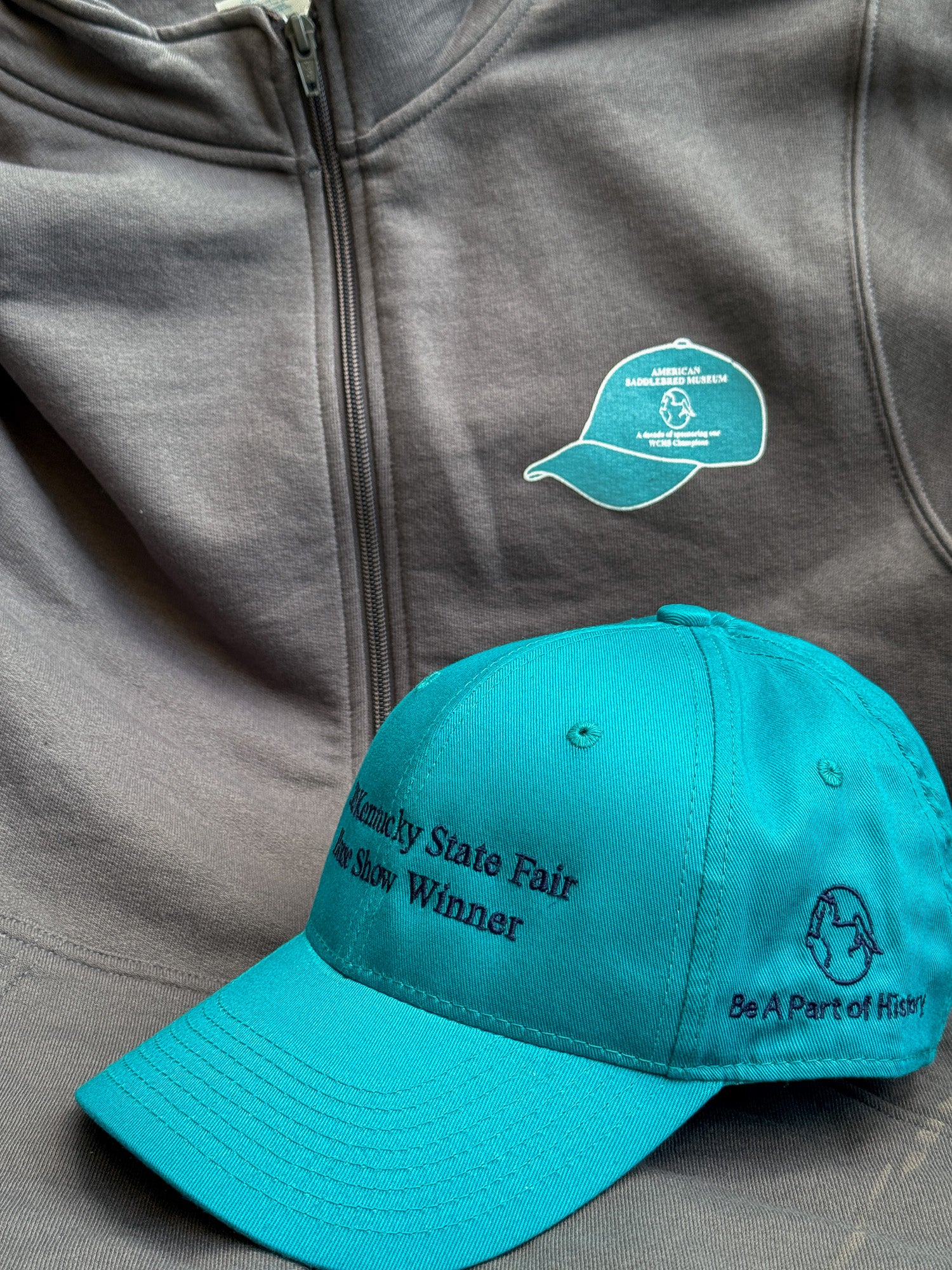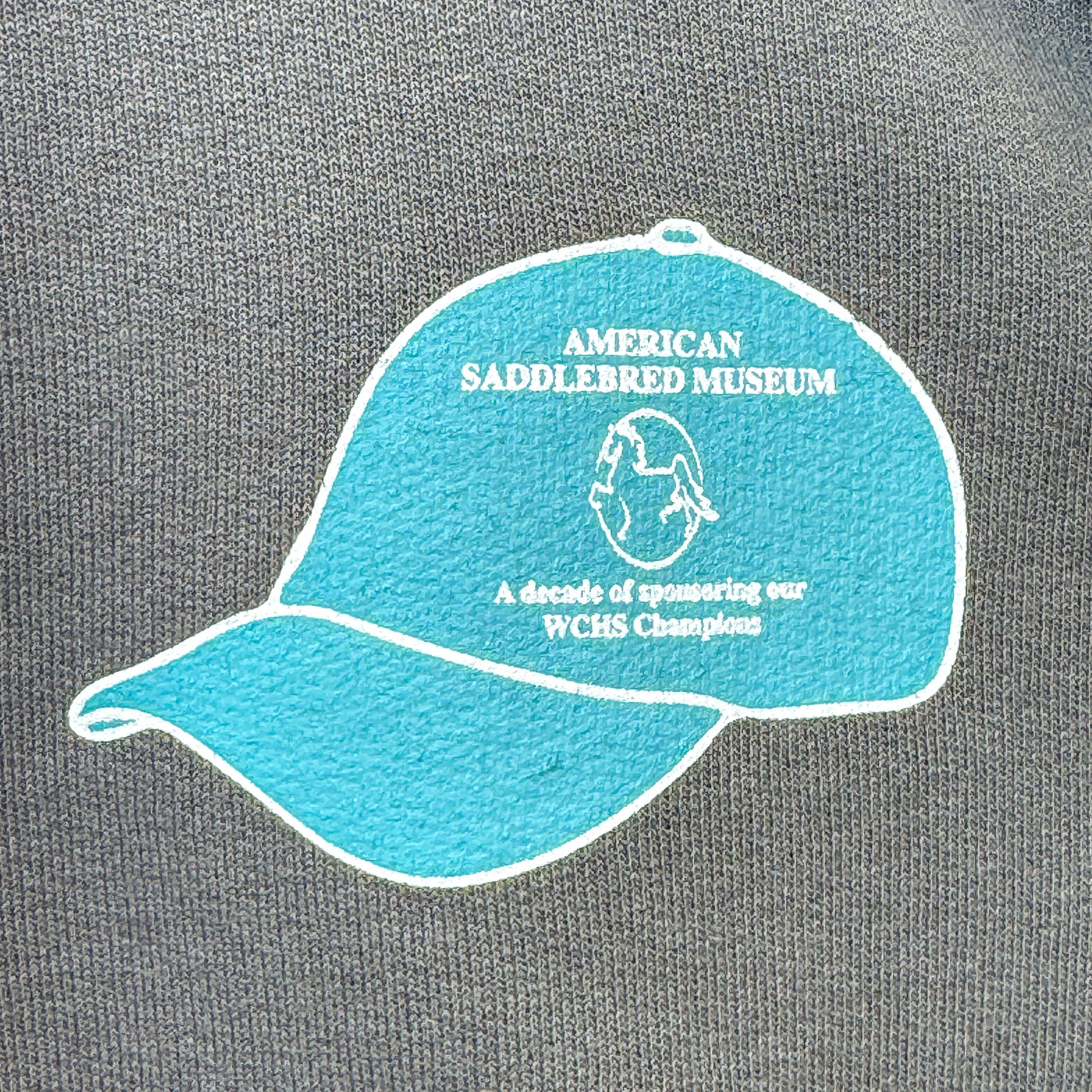 Celebrate a decade of tradition with the American Saddlebred Museum’s exclusive 10th Anniversary WCHS Champion’s Hat Zip-Up Sweatshirt. For 10 years, the Museum has proudly sponsored the iconic hats presented to Kentucky State Fair World’s Championship Horse Show champions. This commemorative design honors that milestone with the 2025 WCHS hat color displayed on the front and a stunning original American Saddlebred illustration by Andy Johns on the back, created exclusively for the Museum.