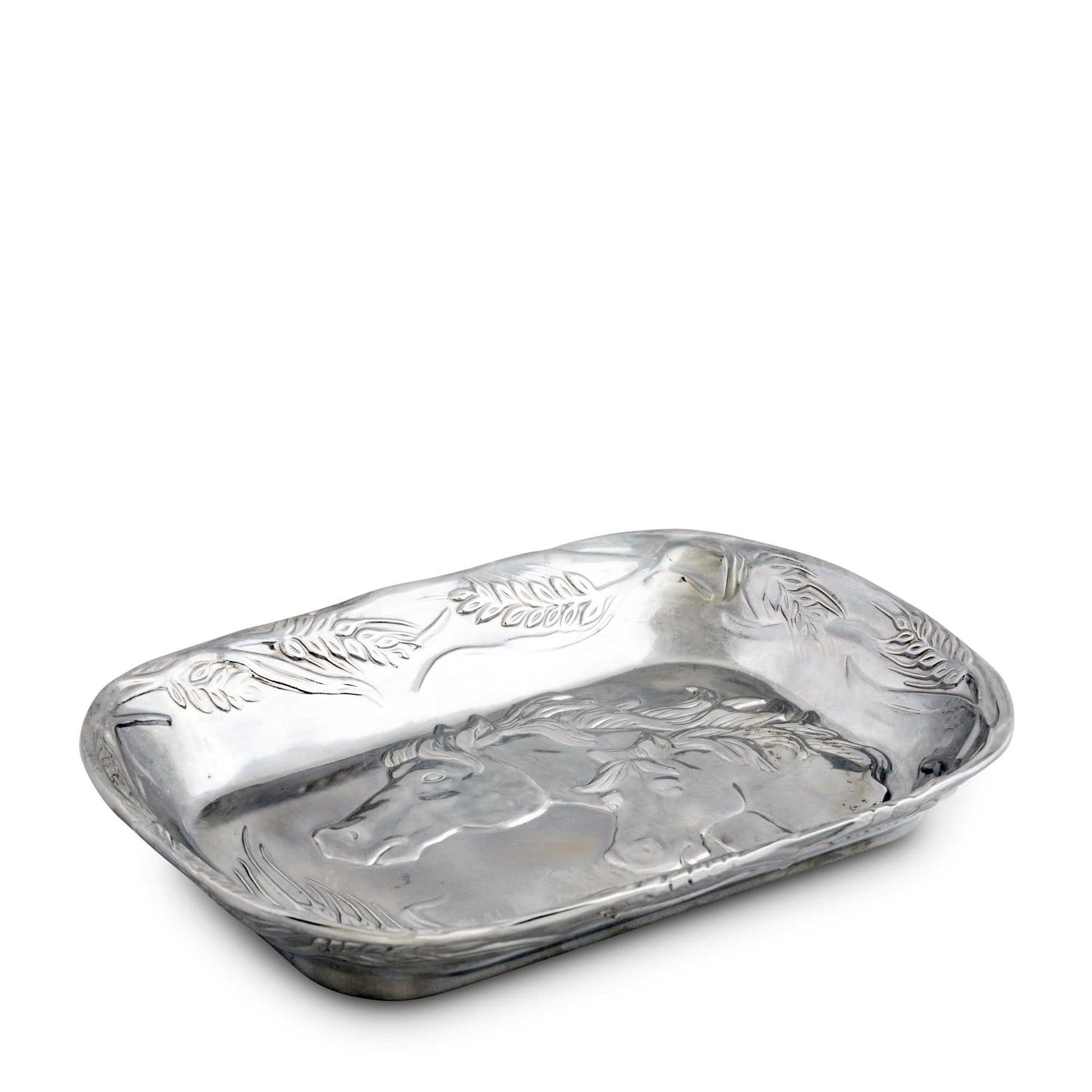 Two horses sniff out their next meal as a stalk of wheat joins them in the center of this dish. Countless other stems of wheat line the sides of this handmade, aluminum piece, their flowing pattern mirrored in the movement of the horses' manes.