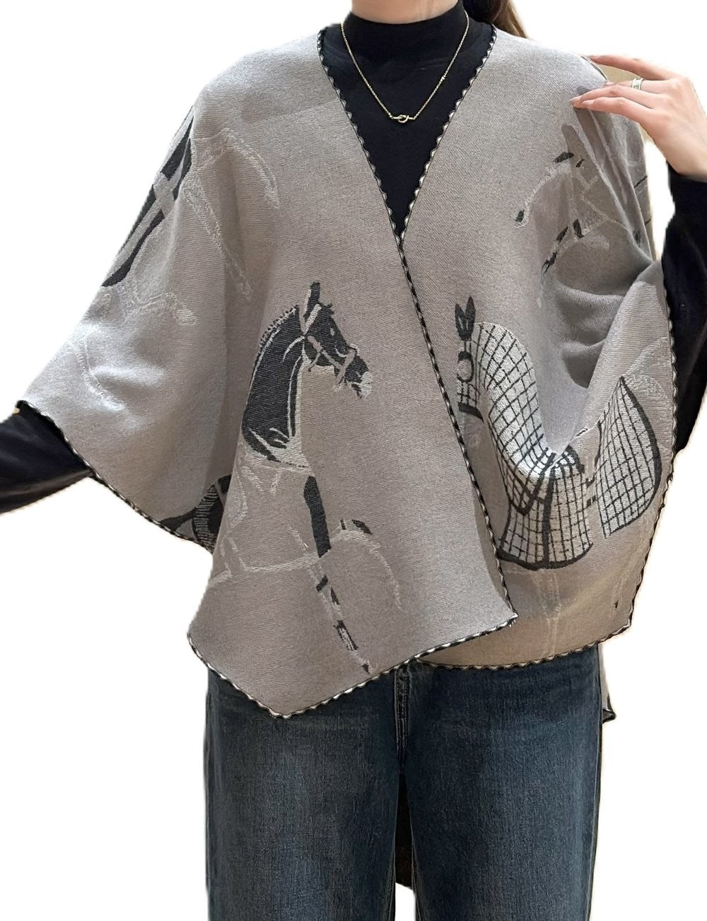 This one size fits all reversible loop wrap, drapes over and accents any outfit, casual or dressy. It has a loop on both sides to make it truly reversible. Wear looped to stay in place or wear loosely as a shawl. It feels and looks like cashmere. A beautiful layering piece! 85% Poly, 15% Cotton.